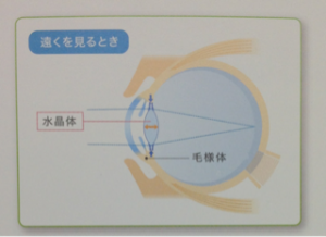 ピント合わせとは、毛様体という目の中の筋肉が水晶体を厚くしたり縮ませたりすることでおこる働きです。