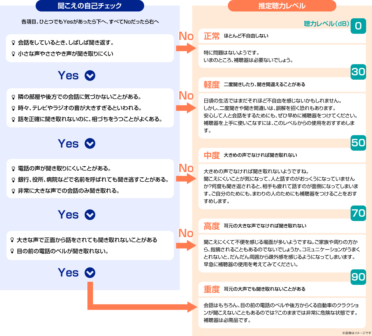 チェックの結果、推定聴力レベルが30以上になった方には、ご来店の上、くわしく聴力測定をされることをおすすめします。