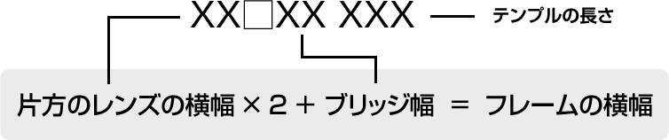 フレームのサイズは、上記3つの部分の長さがテンプルまたはブリッジの内側に表示されています。